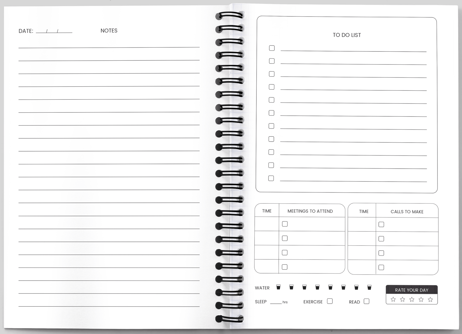 Structured daily layout with to-dos, notes, meetings & calls